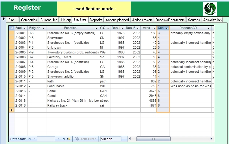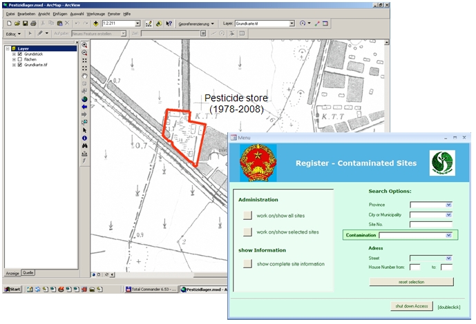 Area and site information are linked with each other through indices and are constantly updated. Formerly registers of contaminated sites were always arranged in parts of maps and records compiled and continued manually. Today registers of contaminated sites are compiled and continued by means of a data bank and GIS software. The digital „register of contaminated sites“ allows a comparatively faster access to individual data and is easier to be continued at lower costs.