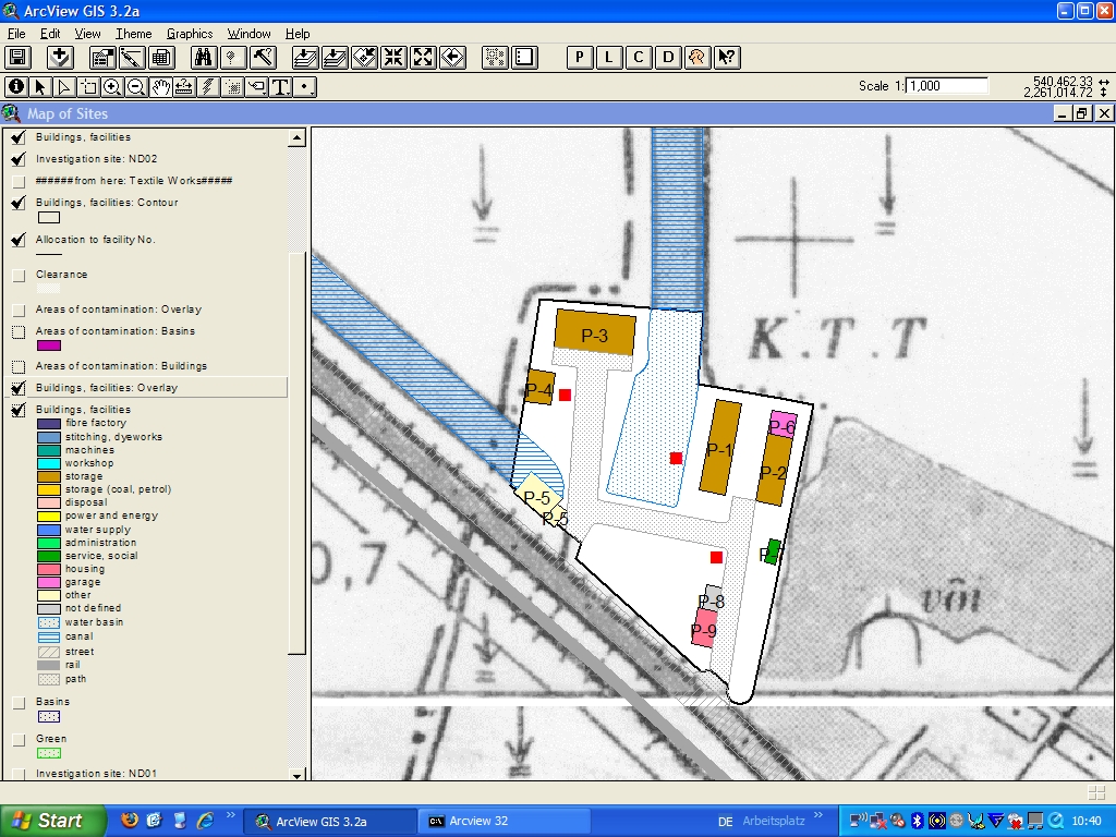 The database contains some data fields, like the exact localization, the owners, the current use and benchmark data of the historical development of the site. The most important class of information is the current and formeruse of the buildings and facilities of the site. Fig. 6 shows as an example the function of each building of a pesticide store as well as the time of use. These data are directly linked with the Geographical Information System.